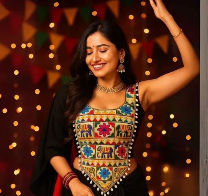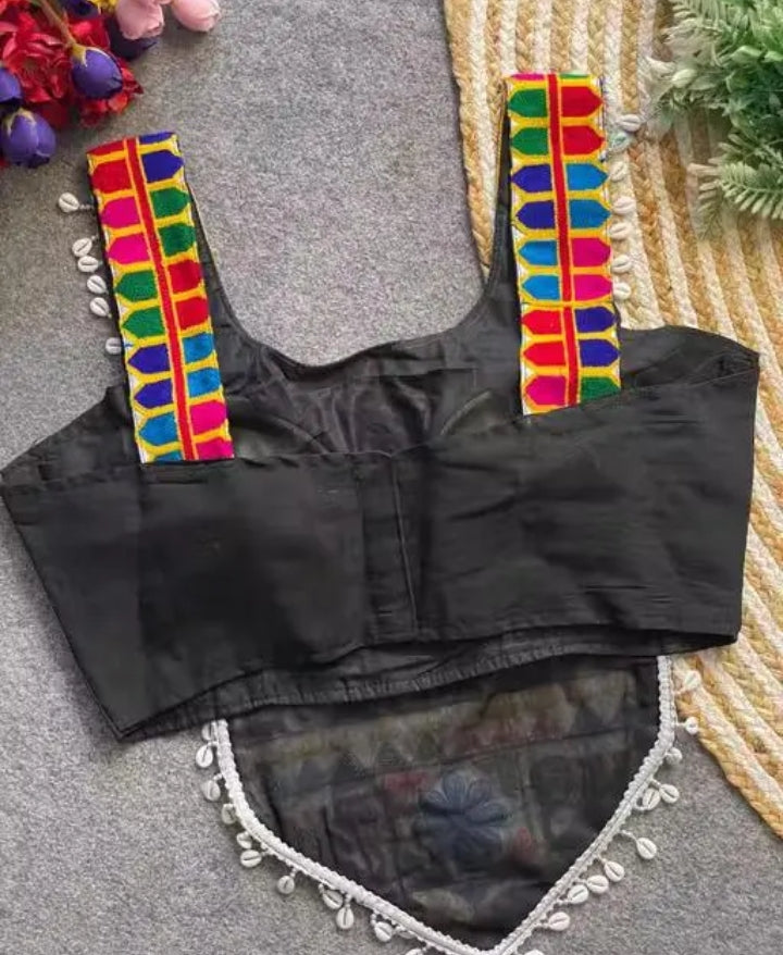 Step into the Navratri vibe with this stunning Black embroidered blouse crafted from premium cotton silk blend. Adorned with intricate kutchi motifs, sparkling mirror work, and elegant kodi (cowrie shell) lace, this blouse is a true festive showstopper. Designed with a graceful back dori and black contrast sleeves, it perfectly complements your Chaniya Choli for Garba nights and festive occasions. A must-have piece to complete your traditional Navratri look!